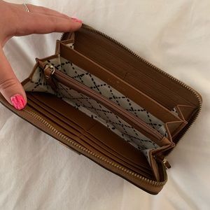 In used condition. Inner compartments are clean, exterior is in excellent shape other than the tarnished logo, which is expected on Kate Spade products.