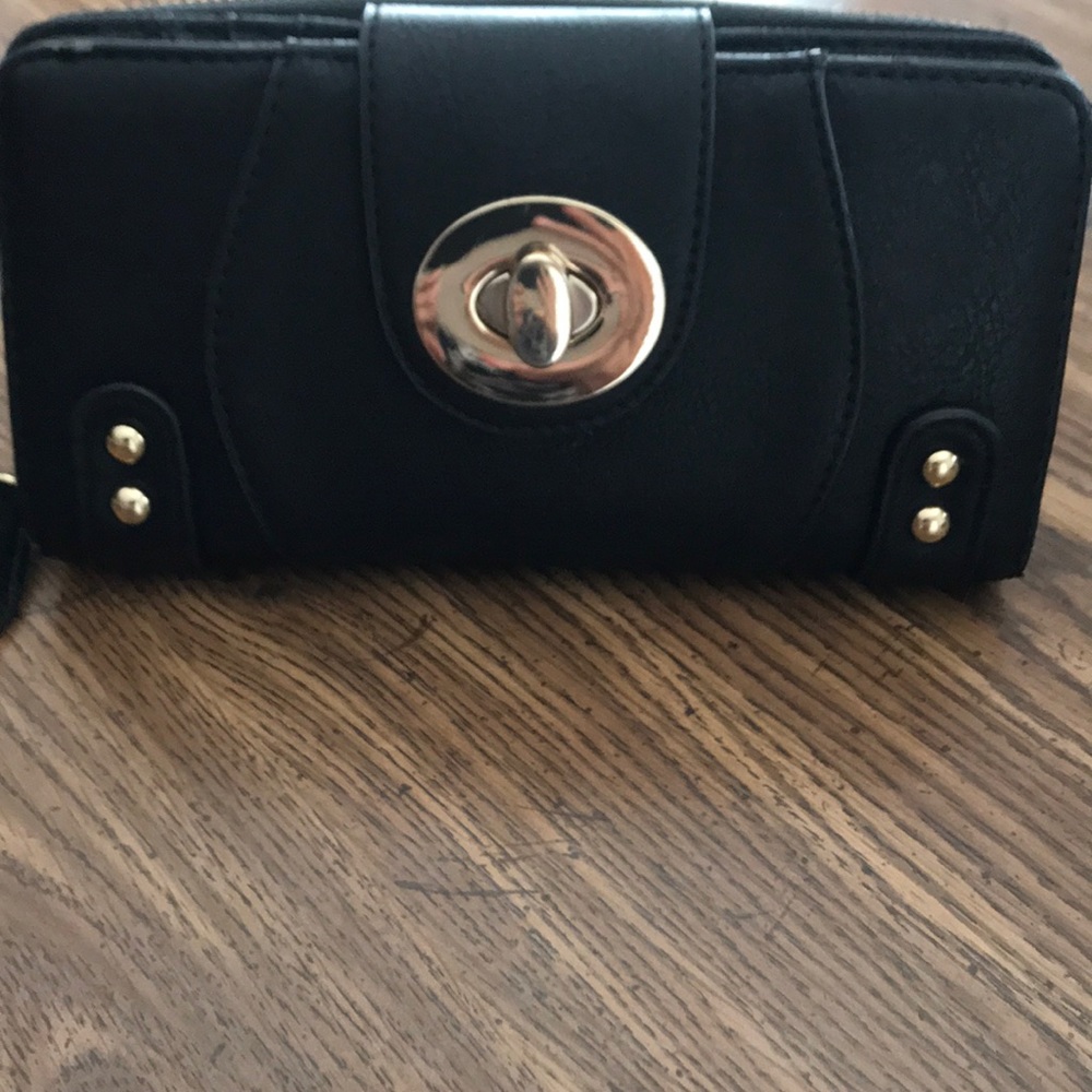 Nice large black wallet. Has lots of compartments to store your ID, credit cards, cash, and checkbook. As shown in the pics there are a couple of areas that show some wear, but this wallet still has a lot of life left in it. Price reflects the wear.