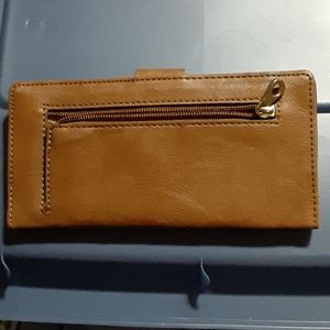 Coral and tan striped wallet by Relic. External slip pocket in front and zippered change purse in back. Holes 11 cards and has 3 slip pockets inside.