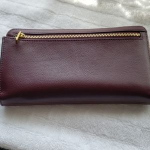 Fossil Liza zip around clutch 13 Credit Card Slots, 1 ID Window, 1 Zipper Pocket, 2 Bill Compartments, 2 Gusseted Pockets. Also has a retractable wristlet strap. Used one time, the size didn't suit me. Smoke/animal free home!