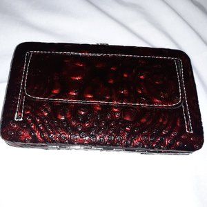 Burgundy and black wallet with a cross design. This wallet will hold your credit cards, money and check book.