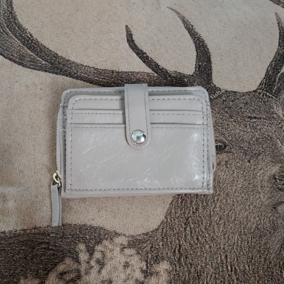 Tan wallet with three card slots in the front and three when you unbutton it with a place for your ID. Zip pouch in the back for coins with a key chain. There is a hole (pictured) where I had a pin. Smoke free home.