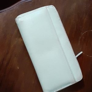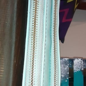 It is a light blue and a little worn out. It is still in very good shape. I dont need it because I bought another wallet. Let me know if your interested.