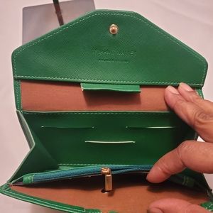 Envelope shape with snap closure. Has 3 card slots with zippered midsection .