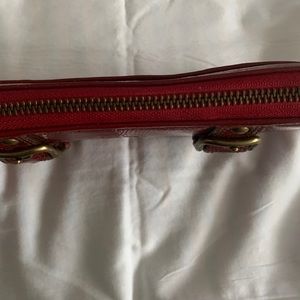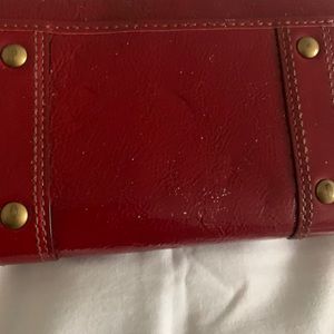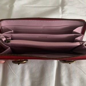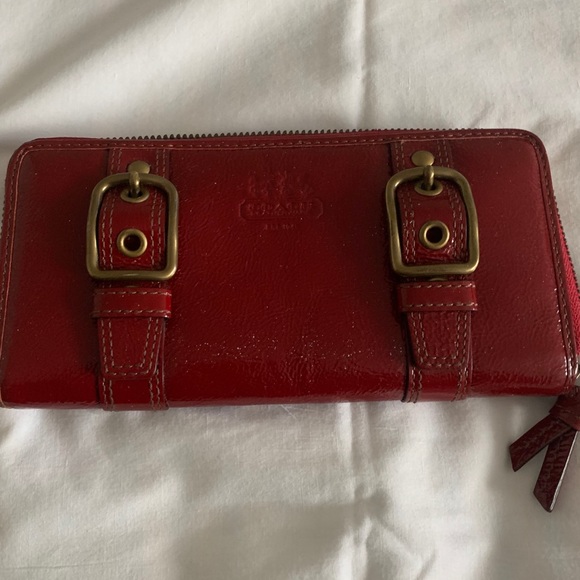 Shiny leather, gold hardware, double buckles, Coach horse & carriage logo, zip around, back pocket, new without tags, no offers