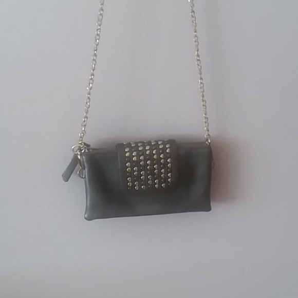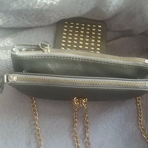 Chain shoulder strap wallet with two zipper pouches. Metallic stud flap closure.