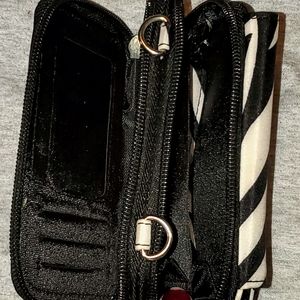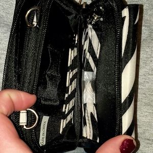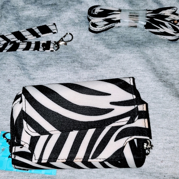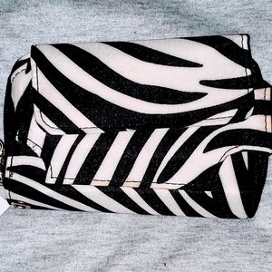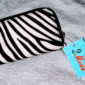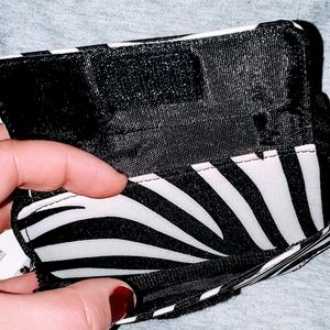 Zebra patterned wallet. Brand new, never used, tags still on. Has lots of card slots and pockets. Includes a wrist strap and a purse strap.