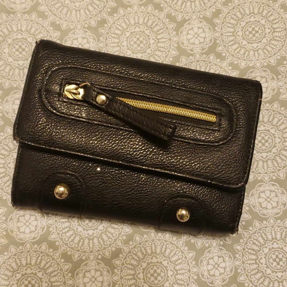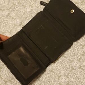 Black wallets with gold detail. In good condition. Has money pocket and change pocket. Zippers work. And many card slots.
