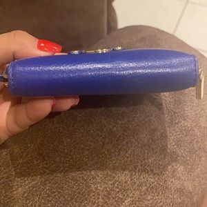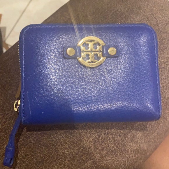 Tory Burch leather wallet with gold logo. In good condition with minimal wear. Minor scratches at front bottom left (see pic). Wallet is missing the keyring (too big) but I will try to include it if found.
