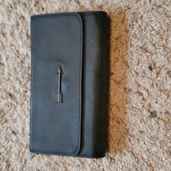 Dark gray wallet in decent condition with an arrow on the front.