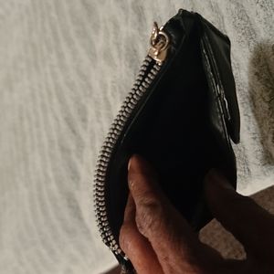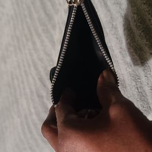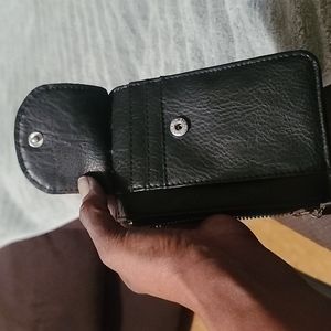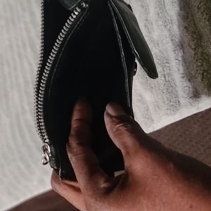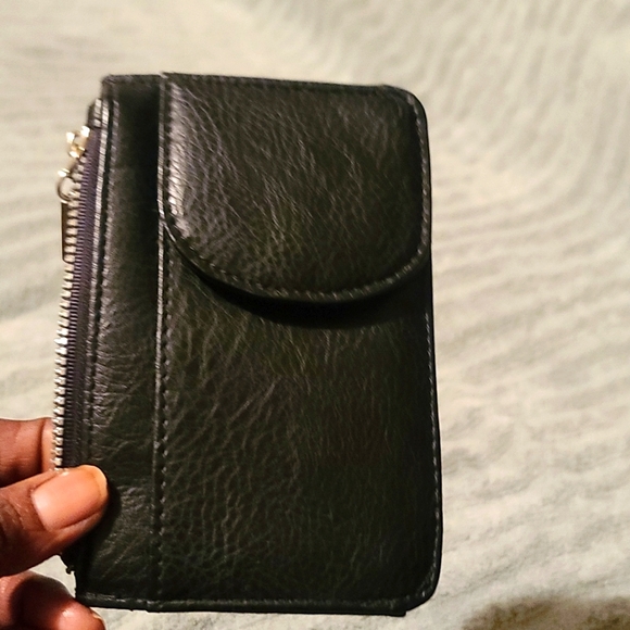 This wallet has many pockets, starting it has a top zipper close pocket.one side has an open pocket and one that button when open it has three card holders. on the other side it has the same pockets one open and one that button when open with three card holders as well.