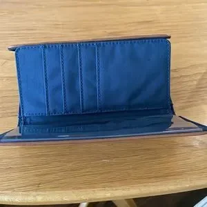 Tommy Hill, brown and tan, has a ton of card slots, has zipper pouch.
