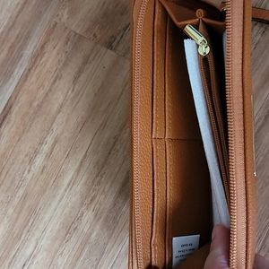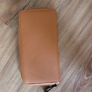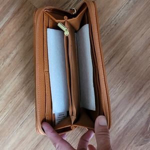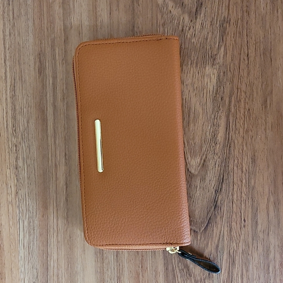 New, never used, basic wallet. Caramel colored, soft "leather like" material. Zippered around outside and zippered coin pocket. Four credit card slots on each side. Two open slots. No brand name.