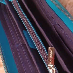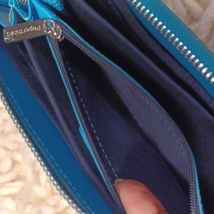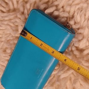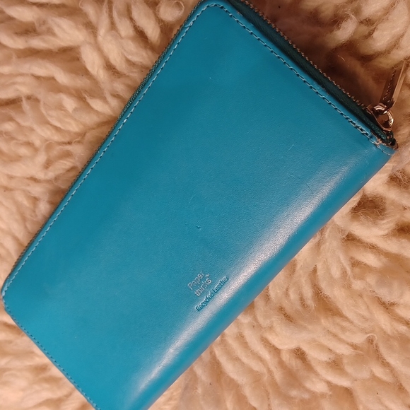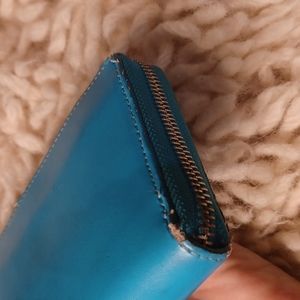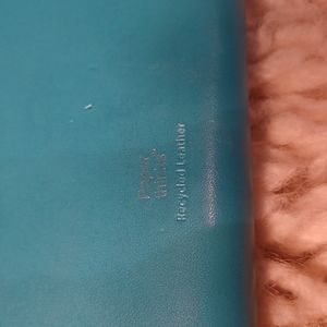 Pre owned Recycled leather wallet Turquoise color Clean interior Scuffs corners