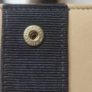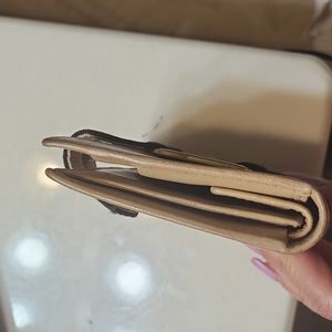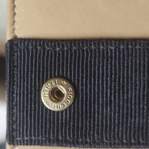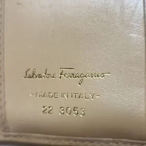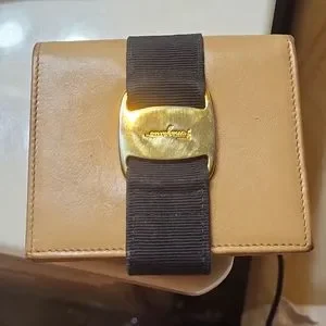 Salvatore Ferragamo kaki wallet. Has two credit cards slots, one cash slot and one change compartment. Ferregamo logo in gold on the front.
