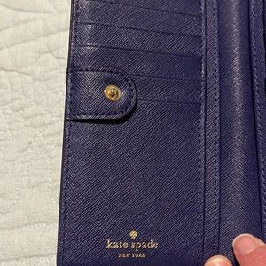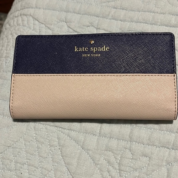 Kate spade cream and navy large wallet with two inside pockets and 15 card spots on the inside with a zipper pouch on the back