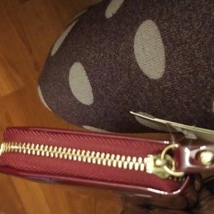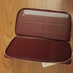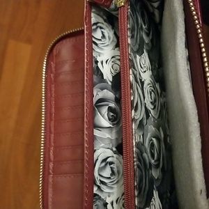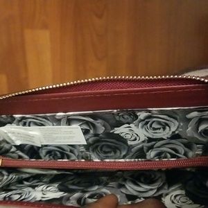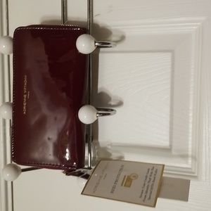 Adrienne Vittadini wallet, NWT it is glossy and wine in color.Multiple card slot and inner zipper closure .Black and white flowery inner pattern.The color is Wine and only option to choose is Purple.
