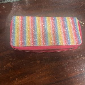 Colorful, sparkly, wallet. Can hold 12 credit cards, pouch for coins, very spacious.