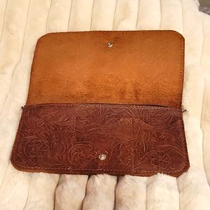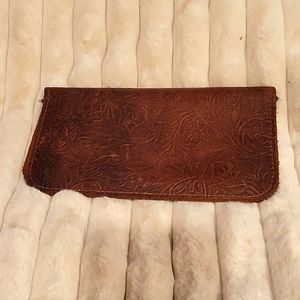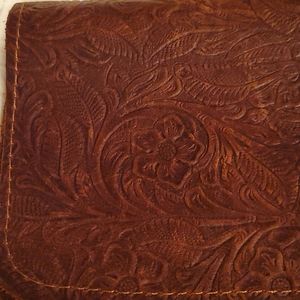 Leather embossed wallet with 3 slots for credit cards and has a zippered pocket with silver colored hardware. Leather has a floral embossed pattern.