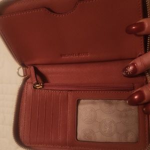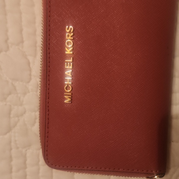 Michael Kors dark rose pink zip around wallet. It has 5 credit card slots and 1 clear photo slot, a zipper for coins, a bill slot, and an extra pocket. Excellent condition never been used.