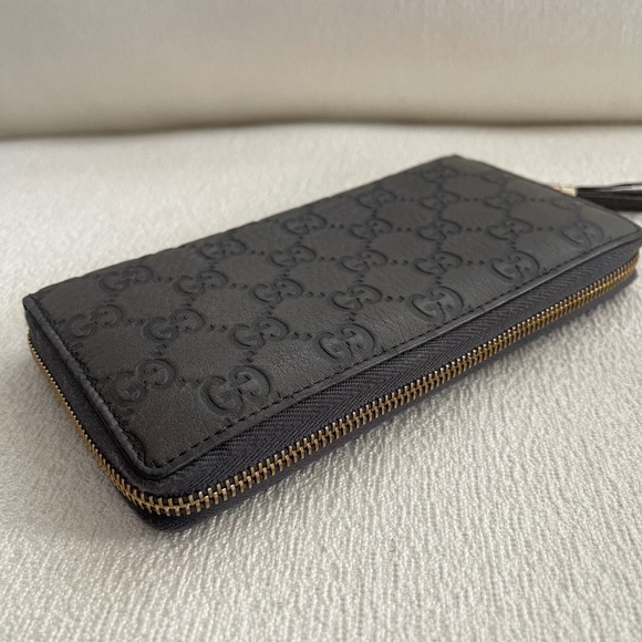 Gucci guccissima embossed calfskin leather zipper wallet with 12 card slots and coin zipper. Bamboo tassel.