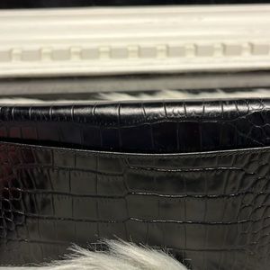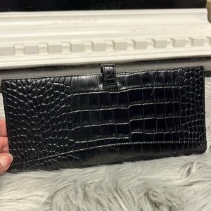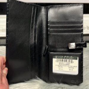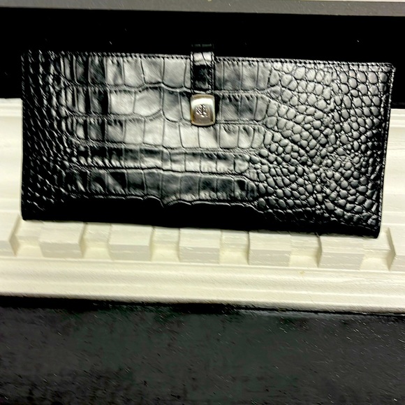 Ralph Lauren black leather wallet. Never used. It could be used as a purse. Several compartments with a zippered enclosure for change. Described as a travel wallet 9x4.5
