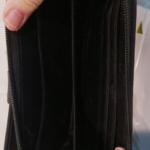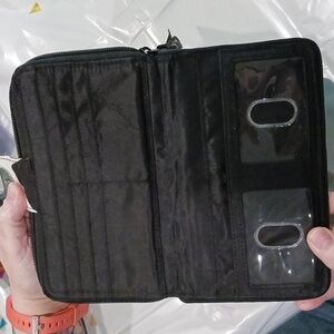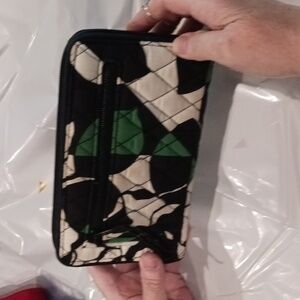 )Argentina Vera Bradley wallet.one outer zipper comparent. inner zipper has 3 comparents with 6 credit card slots. clasp area has 2 compartments, one with 2 ID slots and 6 credit card slots. EUC.
