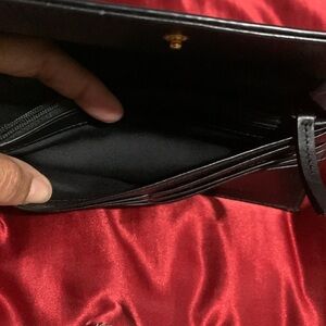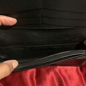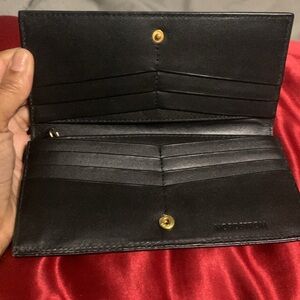 Wallet is pebbled leather, has 1 zippered pocket, 14 card slots, a long slot on back, gold snap closure. Like new condition.