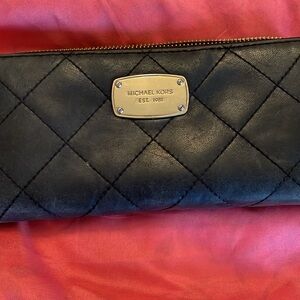 Women’s Michael Kors black wallet - holds 12 cards - cash- zippered pocket for coins. Soft leather. Some wear noticeable.