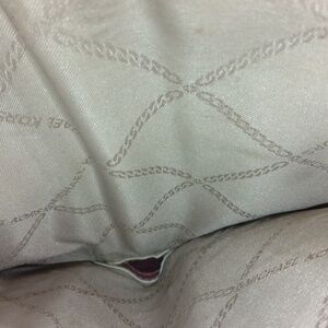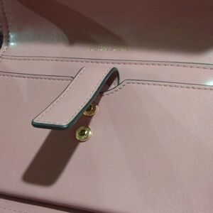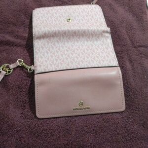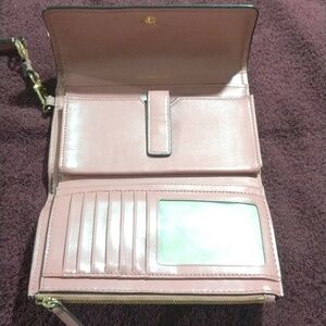 This is a Michael kors dark pink big wallet. It has one zipper pocket, 7 card slots one button pocket on the inside, two check book size slots and one big slot for dollars. There's no stains or loose threads. like new condition.