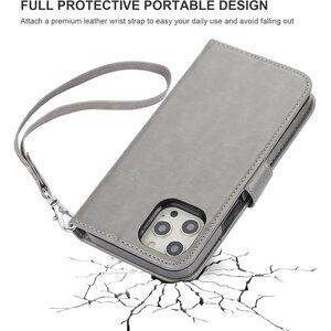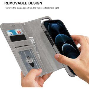 Bocasal's iPhone 12 Pro Max Wallet Case in gray is compatible with MagSafe wireless charging. The RFID-blocking, magnetic leather case includes a card slots holder kick for convenience and protection.