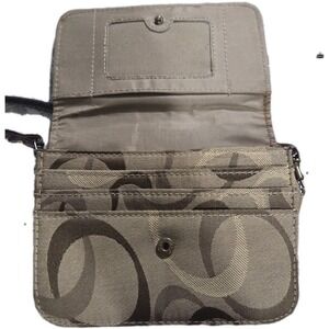 The Wallet Crossbody Purse in brown and tan is a stylish and practical accessory for women. Made from durable canvas material with a fabric lining, this small purse features a snap closure and a brown faux leather handle drop. The crossbody style and adjustable strap drop make it easy to carry, while the logo pattern adds a touch of personality. Perfect for on-the-go use, this purse combines fashion and functionality in a compact design.