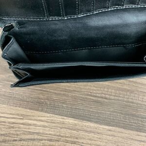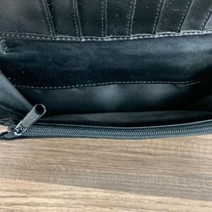 This is an unbranded zip around wallet, but is stamped Genuine Snakeskin on the inside. Beautiful leather. Slots for 9 credit cards, a zippered pocket and 2 slip pockets.