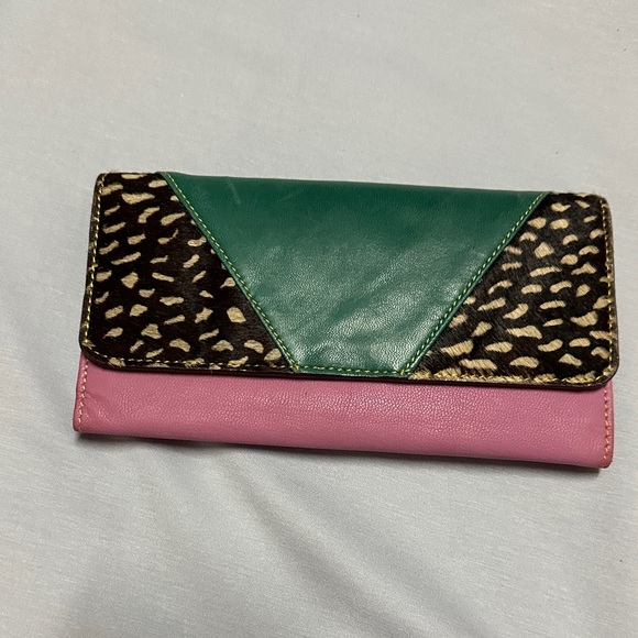 Stylish women's wallet featuring a vibrant pink and green design with a unique animal print accent. Perfect for adding a pop of color to any outfit.
