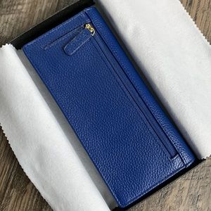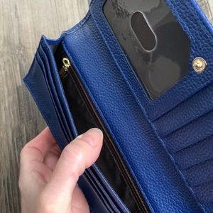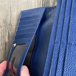 11 card slots, 1 ID slot, 2 currency/bill pockets, 1 inside zippered pocket, 1 outside zippered pocket for change.