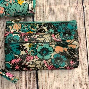 This set comes with a regular sized wallet (and detachable wrist-strap) and a matching card holder. The wallet is a faux leather material and the cardholder has a glossy finish. Both are in great condition!