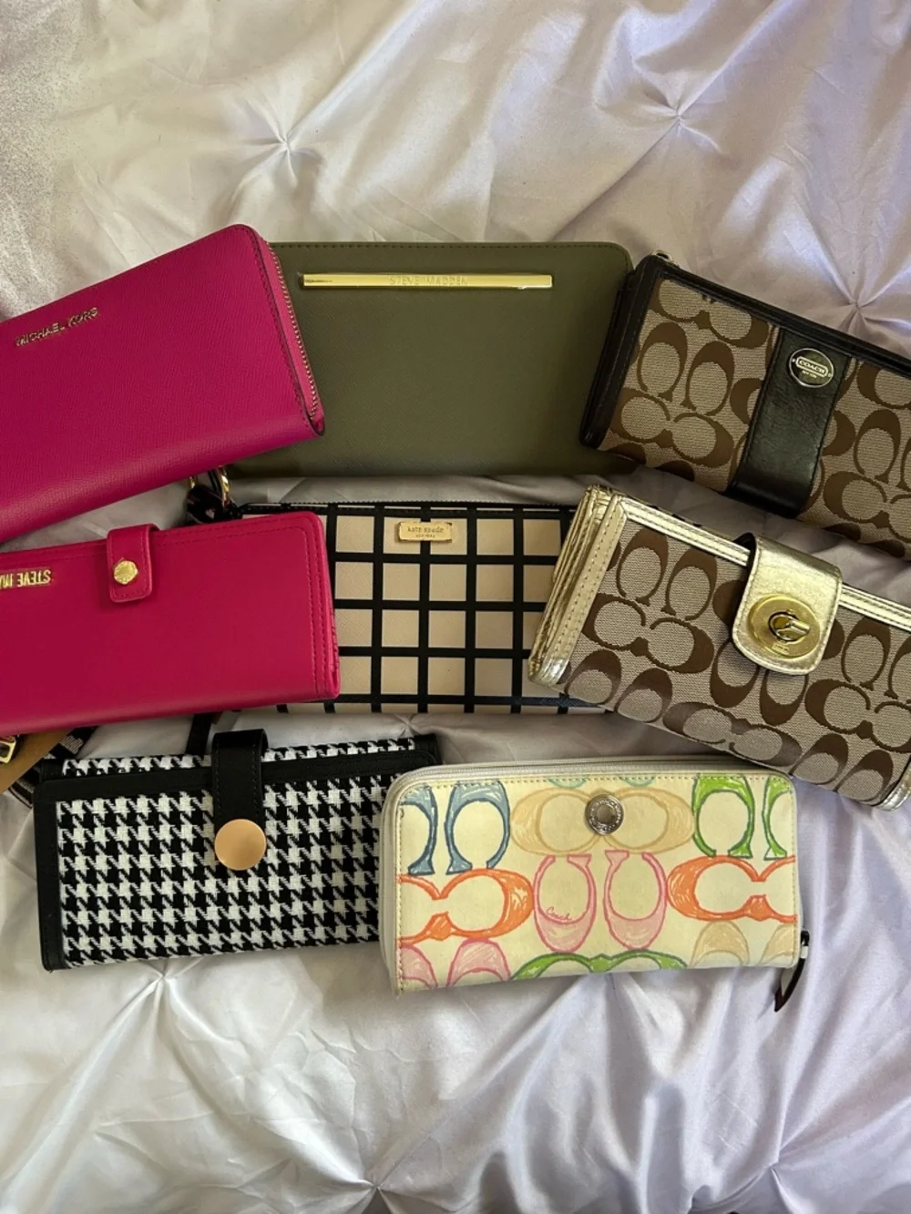 Pre-own, NWOT and NWT wallet set. Three preown Coach walllets, NWOT window pane Kate Spade, NWOT Michael Michael Kors hot pink, NWOT houndstooth, NWOT hot pink Steve Madden and NWT Steve Madden olive. Offers welcomed.