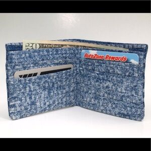 Highly durable wallet made from an old pair of vintage jeans. The fabric is very strong, and stitched with heavy duty thread. Containing 4 pockets for cards and one for bills, it has plenty of room.