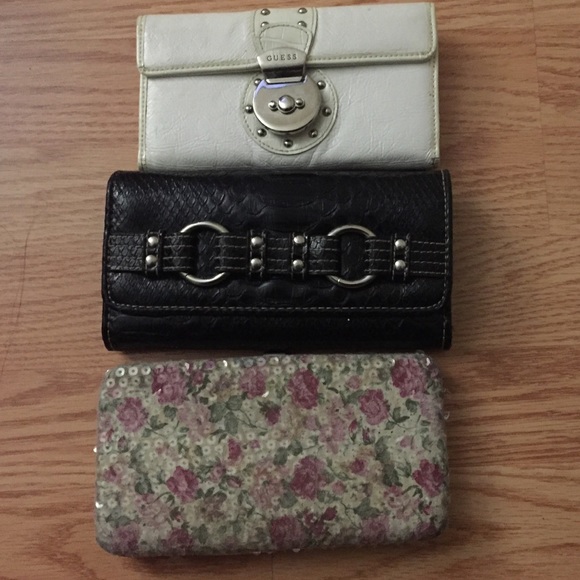Guess wallet that has a little wear and tear and black no brand wallet with no wear and tear. Floral wallet is from charming Charlie which has been used but still I'm good condition.