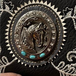 Aero bright pink wallet with multiple card slots. And a black with Horse metal with embroided wallet Stylish. Black wallet pull zipper broke but its cute wallet.