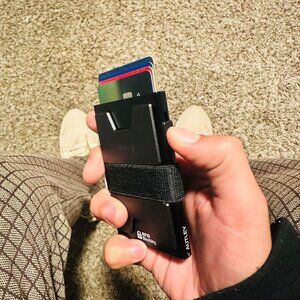The minimalist wallet features built-in ejection mechanism, which makes you just push the side lever, the cards in the card case pop up at a step pattern that makes it easy to grab the card you need. Very convenient to use. Fast checkout, no waiting.