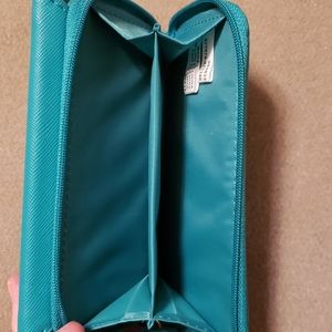 1 snap to open the bifold where you can eclose dollar bills and has 7 slots for cards also has a pocket behind behind 1 side of the slots for even more storage. Outside has 1 full size zipper for change with a divider inside. Its big enough to easily get your fingers in to grab change unlike some wallets where you go to grab the change & your fingers get stuck due to how small it is. Please see pics for measurements. Brand new tags still on.