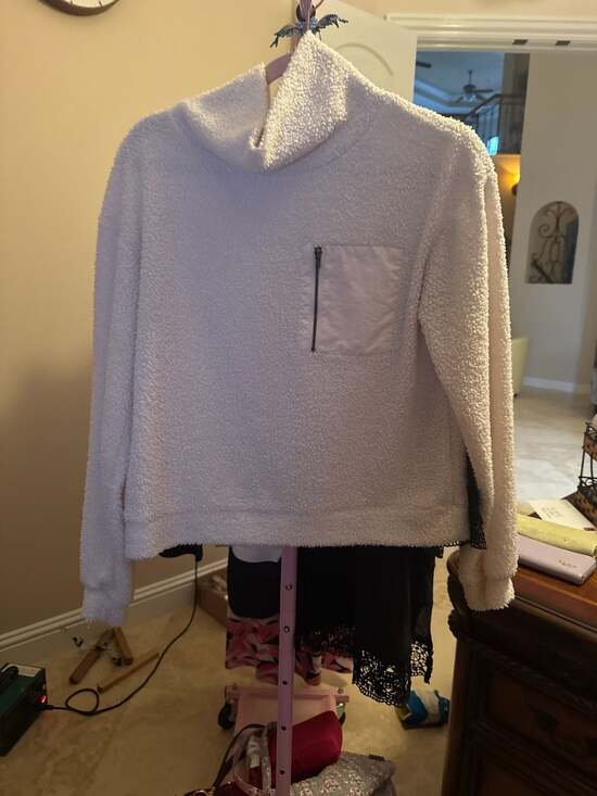 Wallflower Women's Sherpa Fleece Pullover, Cream/White, Size M — Cozy and warm. Features a soft faux-shearling texture with a mock neck for extra warmth. Includes a contrasting nylon zipper pocket on the chest for a utility-inspired look. Long sleeves with ribbed cuffs. Perfect for layering during fall and winter seasons. Excellent pre-owned condition with no stains or holes.