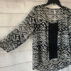 Black and white geometric print blouse by Wallflower. This sheer top has a rounded slightly scooped neckline and a hi low bottom. It has 3/4 length sleeves with an elastic band for cuffs. The front has a crochet cutout band that runs vertically down the middle. It is pre-owned, in great condition, with the exception of a 2" section of stitching that has pulled apart between the crochet cutout and the geometric material on the front (see photos).