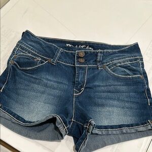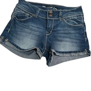 These Wallflower blue jean shorts boast a medium wash and a stylish cuffed hem, perfect for a casual day out. The shorts feature a standard waistband with belt loops, ensuring a comfortable fit. Enjoy the timeless appeal of denim with a slightly faded look that adds character to your wardrobe.