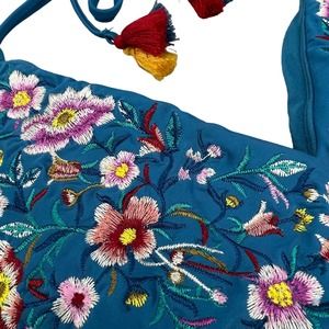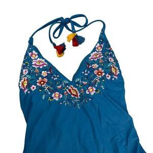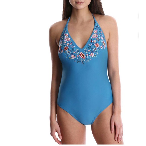 Wallflower Emily Embroidered Flower One-Piece Halter Swimsuit - Blue-Women Small