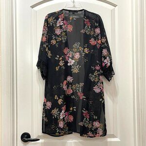 Wallflower Kimono XS Black Floral Open Front Lace Trim Beach Cover