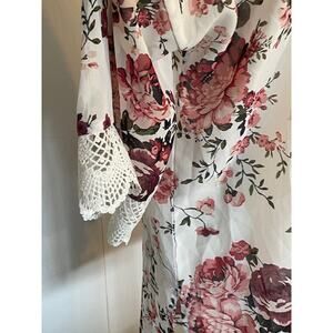 Open front cardigan style coverall in size small. It has 3/4 sleeves with a 3" lace trim. The fabric is cream in color with a burgundy and green floral pattern—100% polyester. 33" length.