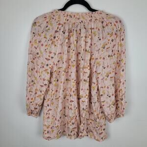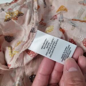 Soft, breathable fabric with whimsical mushroom print in earthy tones. Flowy peasant-style silhouette with smocked neckline and 3/4 sleeves. Lightweight and airy for easy wear through all seasons. New with tags attached.