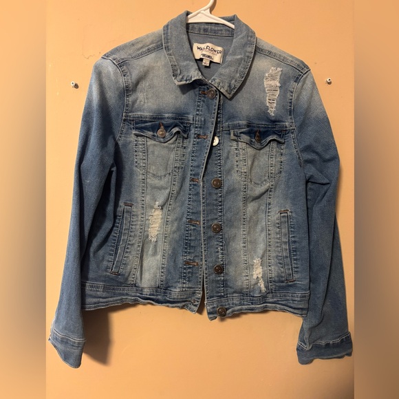 This Wallflower blue jean jacket offers a timeless denim look with its light blue hue and traditional styling. The medium wash finish and subtle distressing make it a versatile piece for casual outings, while the full-length sleeves and classic collar add to its iconic appeal.